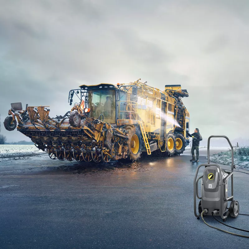 Апарат високого тиску Karcher HD 8 / 18-4 M Cage з міцною сталевою трубчастою рамою для щоденного використання на промислових підприємствах, будівельних об'єктах і підприємствах автобізнесу. Без функції нагріву води. Може працювати як у вертикальному, так і горизонтальному стані.